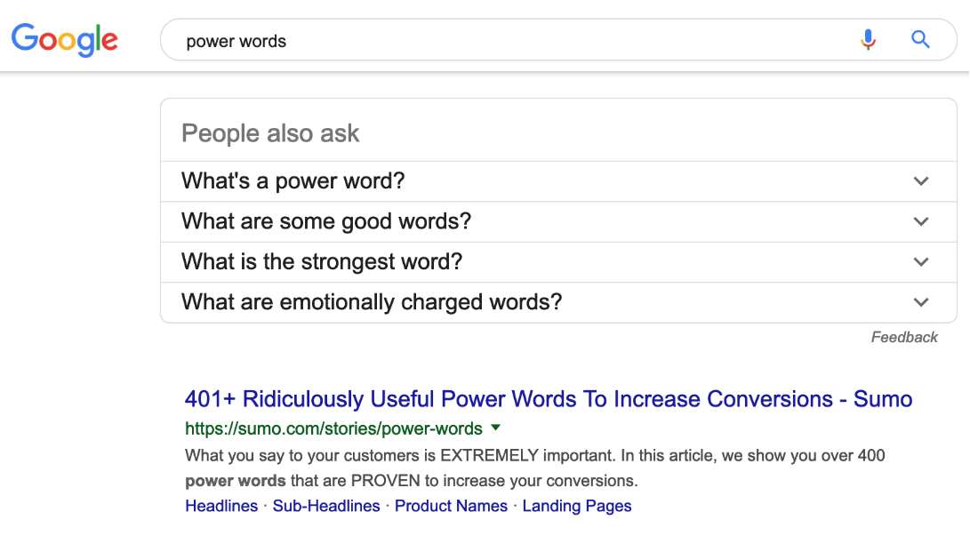 Today I'm giving away the complete list of "power words" Sumo uses in its headlines. They help us: Rank blog posts on Google (our power words blog post with the power words "Ridiculously Useful" in the headline ranks #1 on Google. Click here to see the headline.)